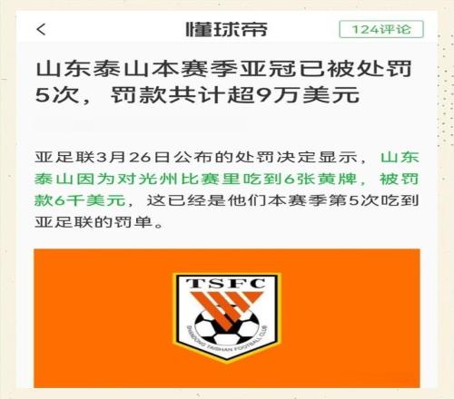 同样因黄牌过多被罚款的还有山东泰山。上赛季泰山队对阵柔佛新山的比赛中,6 名队员被出示黄牌警告,俱乐部因此被亚足联处以 4500 美元罚款。事实上,山东泰山或许是亚足联处罚名单中的 “头号贡献者”:此前,泰山主场球迷向场内投掷水瓶并辱骂球员及裁判,俱乐部被罚款 1.7 万美元;随后,泰山队球员及官员因骚扰比赛裁判,俱乐部再被罚款 5.675 万美元;第三次则因部分泰山队球迷展示含敏感信息的横幅,俱乐部又被罚款 6000 美元。此外,山东泰山还因上赛季亚冠精英联赛退赛,被禁止参加亚足联旗下赛事 2 年,同时需退还 80 万美元参赛费及奖金,并支付 5 万美元罚款和 4 万美元赔偿金,总计损失 89 万美元(约合人民币 639 万元)。