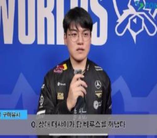 Gumayusi:我们一看对面是上单韦鲁斯就决定我去上路跟他打,TheShy选手的上路AD很有名嘛,我很紧张也玩得很有趣,很感谢他用了T1的韦鲁斯冠军皮肤