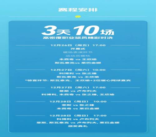 本届赛事以“你我皆是主角”为办赛主题,除了高水平高密度的网球对抗以外,还将在跨年节点为网球迷们营造多元的网球体验场景。比如举办首届大湾区“网球生活节”,包含网球文创、赛事体验、美食消费等,8位球星亲临现场,邀请全国的网球迷在深圳从圣诞节畅玩到元旦新年。另外比赛期间还会有时尚红毯秀、直播大盛典等嘉年华场景,世界球星和娱乐明星在此汇聚一堂,为中国网球迷们贡献一场无与伦比的视觉盛宴。