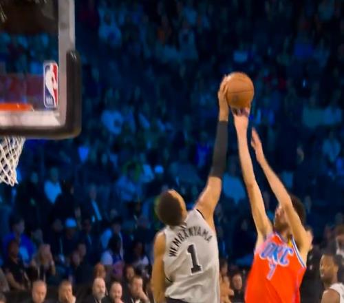第四节决战,切特单打文班亚马欲跳投,文班亚马劈头盖脸大帽扇飞,卡鲁索反击炸裂单臂暴扣连拿4分,双方战至平手。文班漂移中投被推腰,依旧无解轰进,随后一抢三再造犯规,最终,马刺111-109爆冷击败雷霆,完成16分大逆转,终结对手16连胜。