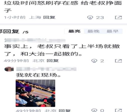 赛后有球迷给出了这样的评价:垃圾时间怒刷存在感,给老叔挣面子;随后有现场球迷在这条评论下方回复:事实上,老叔只看了上半场就撤了,和大郅一起撤的。并且还附带了现场拍的照片,说明这一场廖三宁表现确实太差,就连郭士强都没眼看了。